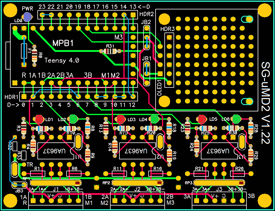 IMPORTANT: The pushbutton on the Teensy PCB is NOT for reset, it initiates a load of the last compiled firmware. Go figure. :( :) So, the only real way to reset the firmware is to unplug the USB cable. A hard reset button may be added to future versions of the SG-µMD2 PCB.