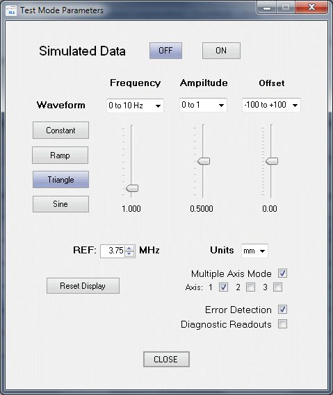 Test Mode is also capable of exercising all three axes singly or in combination but the function generator data will be the same for all. This is controlled by the Multiple Axis Mode checkbox. When enabled, Axis 1, Axis 2, and Axis 3 checkboxes will appear below it with Axis 1 being the default on startup. Turning Multiple Axis Mode off will put the GUI back in Single Axis Mode. But this will be overidden when Test Mode is turned off if the USB port is enabled and the firmware is running with multiple axes.