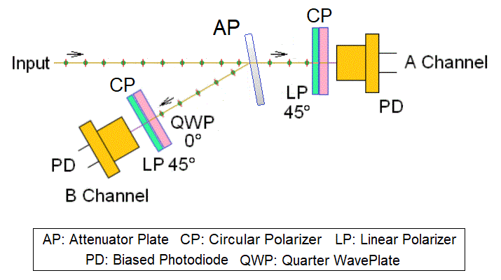 Some resourcefulness will be required to mount the parts in this kit to put together a Quad-Sin-Cos decoder. A variable attenuator plate is included that may be used as the NPBS. Pieces of CP will be satisfactory for both the combination of the LP+QWP (since that's exactly what the CP is), as well as the LP (flipped) since the output polarization doesn't affect PD behavior. See the information on polarization, below.