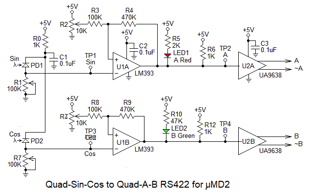 Prt# Description Comments ----------------------------------------------------------------------- U1 LM393P, 8 pin DIP Dual voltage comparator C2 0.1 µF capacitor Power supply bypass for U1 LED1 LED, red Thresholded Sin, A LED2 LED, HB green Thresholded Sin, B R0 Resistor, 1K Photodiode protection R1 Trim-pot, 100K-200K Sin (Channel A) load resistor* R2 Trim-pot, 10K Sin (Channel A) threshold R3 Resistor, 100K Sin (Channel A) trim-pot isolation R4 Resistor, 470K Sin (Channel A) hysteresis R5 Resistor, 2K-2.2K Red LED current limiting R6 Resistor, 1K Channel A pullup R7 Trim-pot, 100K-200K Cos (Channel B) load resistor* R8 Trim-pot, 10K Cos (Channel B) threshold R9 Resistor, 100K Cos (Channel B) trim-pot isolation R10 Resistor, 470K Cos (Channel B) hysteresis R11 Resistor, 36K-47K Green LED current limiting R12 Resistor, 1K Channel B pullup SBB1 Solderless breadboard with 400 tie points