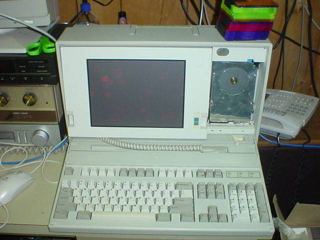 This machine is one of the two so-called "luggable" models that IBM produced as a part of the PS/2 family. With the 8573-401 (P75) model you got a 486DX-33 CPU, onboard SCSI and four expansion slots. All things considered this was a high end mobile computer system in its day. It runs from AC power only and has no battery inside. Both the P70 and P75 "luggable" systems were very expensive when new. (The P75 retailed for about $19,000 when new!) As a result, neither unit is overly common...so if you can find one, it may well be worth picking up. The display panel is a plasma type and displays everything in a brilliant orange color. It is capable of 16 color VGA output at most. The P75's onboard graphics are a sort of mix between XGA-1 and VGA...only VGA modes are available on the internal panel and it would appear that there are actually two graphics subsystems in the computer. When driving an external CRT display you can use any mode the XGA-1 and your software is capable of. This computer was a little rough when I got it. Upon arrival the floppy and clock battery were dead. I replaced the special clock battery module with a standard 4xAA battery holder. The floppy has been replaced temporarily with a spare 2.88MB unit while I try to revive the 1.44MB drive that was in it. For now this drive is just hanging loose as the eject button is a little too long to fit in the stock mounting arrangement. This machine has the following hardware installed in it right now: 486DX-33 CPU 16MB RAM 500MB Quantum SCSI hard disk 2.88 MB Floppy Drive Back> |