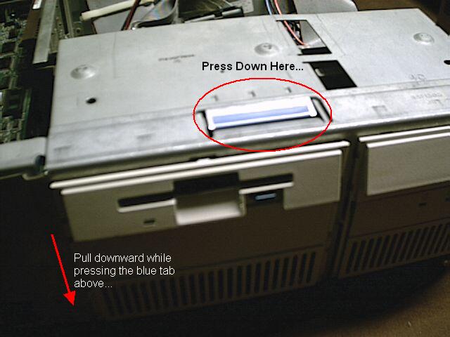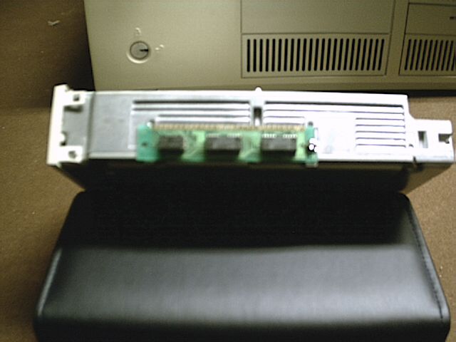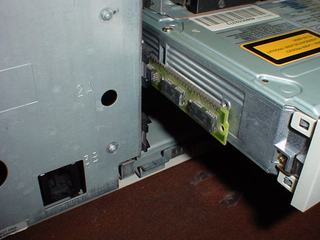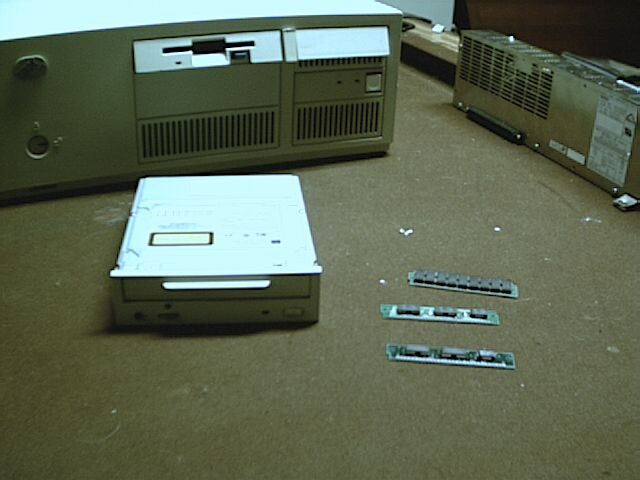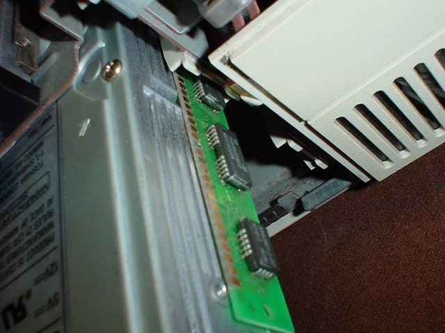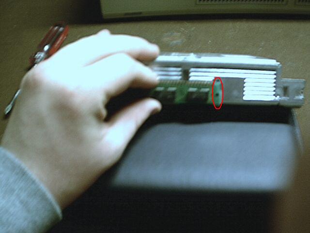 Requirements: Some self confidence and a careful hand are also highly recommended. 1. Start by getting your PS/2 out in a well lit location free of places where parts can wander off and not be seen again. Get the drive you plan to install, the 256K SIMMs you plan to use (you'll need two of them for this) as well as the screws you plan to use. Finally, make sure you have a screwdriver of the appropriate type. 2. Remove the cover from your PS/2. Set it aside in a safe location where it won't fall and possibly break. 3. Take a look at your SIMMs. They must look like the circled example in this picture: 4. As per the picture, set your CD-ROM drive up so you can clearly see the screw holes in the side of it. What we're most interested in now is the hole that I have marked with a circle in the above picture. Why? Because the SIMM has a hole punched in it and what we're going to do next is to line that hole up with the screw hole in the CD-ROM drive. 5. Now I've actually fastened the SIMM onto the CD-ROM drive side. I didn't take a picture of the actual process for the other side, but it should be self-explanatory as to what to do on the other side. Note: As you can see in the picture above, the SIMM is placed so that the its connecting pins face toward the top of the drive. This is done so that the screw hole and the hole cut in the SIMM line up. If you don't do it this way, then you won't be able to fasten the SIMM to the drive. Before you go on to step 8, make sure you have set the SCSI ID (or IDE master/slave setting for the Model 40sx) appropriately, as it may not be easy to reach and change when the drive is installed. 8. With the "bezel cage" removed, proceed to mount the drive. Again, be sure to go slow and be careful. 9. Put the "bezel cage" back into place and align your CD-ROM carefully if needed. If the bezel cage won't go on, you may need to gently move your CD-ROM drive up and down a little before it will go in. The SIMMs move just enough to allow you to make this final adjustment. Cable up your drive as needed, and put the system cover on once you are happy with how everything looks. Your comments are welcome! Please send them to me!